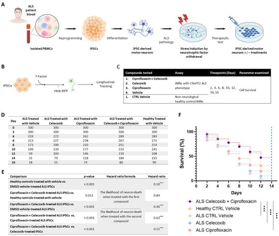 In our experiments, PrimeC combination-treated ALS iMNs demonstrated survival rates comparable to those of healthy control iMNs and significantly higher survival compared to ALS iMNs treated with vehicle, ciprofloxacin alone, or celecoxib alone. ALS drug development has recently witnessed a spurt of iPSC-based studies, either for mechanism examination, safety, drug screening, or efficacy [23,24,27]. While these findings are promising, it is important to acknowledge that in vitro iPSC-derived models, despite their relevance, cannot fully recapitulate the complexity of ALS pathology [28].