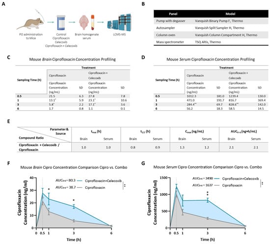 (A) Schematic overview of the mice drug concentration profiling study design. Fifty-eight male C57BL mice were divided into twelve treatment groups and administered a single oral solution dose of either ciprofloxacin alone or the PrimeC combination (ciprofloxacin + celecoxib). Each group was sacrificed at predetermined timepoints up to 6 h post-administration, followed by collection of blood serum and brain tissue samples for analysis. (B) LC-MS/MS system setup used for quantification of ciprofloxacin concentrations in brain and serum samples. System setup ensuring precise and consistent measurements. (C) Mean ciprofloxacin concentrations measured in brain samples at each time point following administration of either ciprofloxacin alone or the PrimeC combination. (D) Mean ciprofloxacin concentrations measured in serum samples following a single PO administration of ciprofloxacin alone or in combination with celecoxib. (E) Ratio of ciprofloxacin concentrations between the PrimeC combination-treated group and the ciprofloxacin-alone group across brain and serum samples at multiple time points. The ratios demonstrate consistently higher ciprofloxacin levels in the combination-treated group. (F,G) Mice drug concentration profiling study results. (F) AUC₀–₆ for brain samples, comparing ciprofloxacin exposure following PrimeC combination administration versus ciprofloxacin alone. (G) AUC₀–₆ for serum samples, comparing ciprofloxacin exposure following PrimeC combination administration versus ciprofloxacin alone. Gray-shaded areas represent ciprofloxacin monotherapy, while light-blue areas depict the combination treatment. Comparisons between treatment groups were evaluated using two-way ANOVA with Bonferroni post hoc test. * p ≤ 0.05, ** p < 0.01. The dotted line at 0.5 h marks the start of administration. The ascending lines from 0 h to this point are for visualization purposes only.