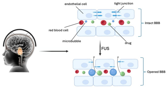 More recent research reports the use of even low ultrasound intensities (<1 Wcm−2) for opening the BBB in neuro-oncology, integrated with microbubbles (FUS/MB). Microbubbles were initially developed as imaging contrast agents. They have a diameter ranging from 1 to 10 μm, with a lipid or protein coating that encapsulates high-molecular-weight gas spheres (e.g., perfluorocarbon) [40,41]. The circulating gas-filled microbubbles expand and contract under the effect of ultrasonic pressure waves (0.2–2 MHz), causing cavitation. Cavitation produces mechanical forces on the endothelium within the focal zone of the FUS, causing sonoporation of the plasma membrane, disruption of the tight junctions, and opening of the BBB (Figure 2) [42,43,44].