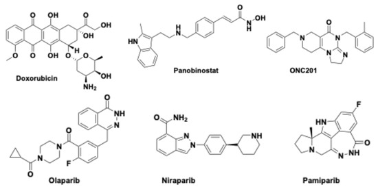 Chemical structures of doxorubicin, panobinostat, ONC201, and some PARP inhibitors (olaparib, niraparib and pamiparib).