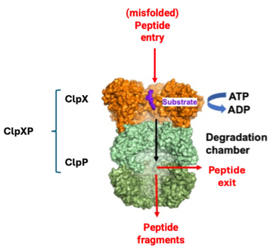 Simplified mechanism of misfolded protein identification by ClpX and degradation by ClpP (modified from [83]).
