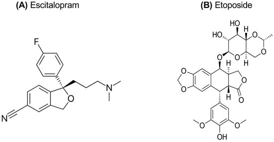 Chemical structure of escitalopram oxalate (A) and etoposide (B).