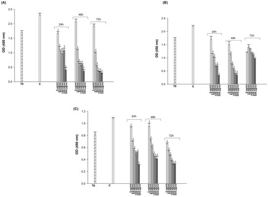The cells were seeded at 5 × 103 cells per well in 100 µL complete medium onto 96-well plates. After 24 h of incubation, the medium was removed. At the end of the incubation period, dose screening for different concentrations of ES (5, 10, 25, 50, 100, 200, 250, 400, and 500 μg/mL) and ET (5, 25, 50, 100, 250, and 500 ng/mL) prepared in medium containing 1% serum was performed separately in 96-well sterile plates in four replicates. Immediately after drug administration, a time-zero reading was taken to determine the initial cell number. Following drug treatments, cells were incubated for 24, 48, and 72 h. At the end of each incubation period, the experiment was terminated, and 10 μL of CCK-8 (Abbkine, Atlanta, CA, USA) solution was added and left to incubate for more 3 h. At the end of the incubation period, the absorbance values of the plates were measured and recorded on an Elisa reader (Thermo Scientific Multiskan Go, Thermolabsystem, Chantilly, VA, USA) at 450 nm wavelength [85]. The results of three independent experiments, each with 8 replicates, were statistically evaluated and compared with the control group, and the IC50 values of each drug were calculated for all incubation times.