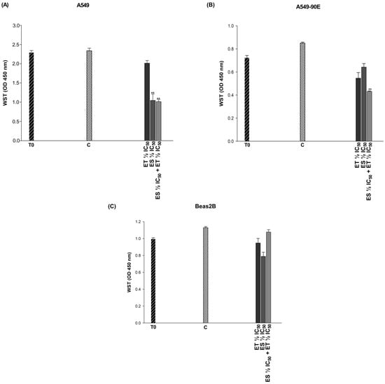 Cytotoxic effects of combinations exhibiting synergistic effects in A549 (A) and A549/90E (B) lung cancer cells and antagonistic effects in BEAS-2B (C) epithelial cells. The statistical analysis of the data was carried out by Student t-test. ** p < 0.01 were considered to indicate a statistically significant differences compared to control group.