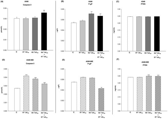 Amounts of caspase3 (A,D), P-gP (B,E), and PTEN (C,F) in A549 and A549/90E cells after ET ½ IC50, ES ½ IC50, and ET ½ IC50 + ES ½ IC50 treatment. The data obtained from the caspase activity assays were evaluated using the one-way ANOVA test and Mann–Whitney U test in the Graph-Pad InStat statistical program. ** p < 0.01 and *** p < 0.001 were considered to indicate a statistically significant differences compared to control group.