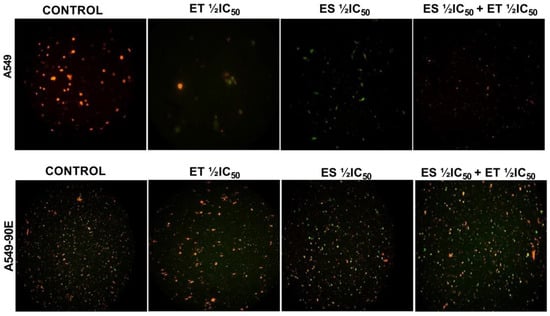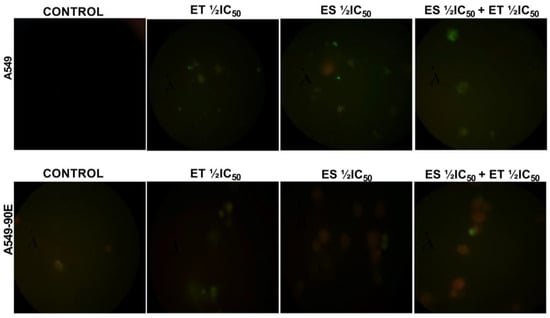 Considering that mitochondrial membrane potential (ΔΨm) has a critical role in cell apoptosis, we determined the changes in ΔΨm in A549 and A549/90E cells after treatment with ET ½ IC50, ES ½ IC50, and the combination (ET ½ IC50 + ES ½ IC50). Competent mitochondria accumulate red fluorescent J-aggregates, whereas green fluorescence of the JC-1 dye signifies reduced mitochondrial membrane potential, indicating that cells are undergoing apoptosis. As shown in Figure 7, in both drugs, alone and in combination, treated cells’ green fluorescent intensity increased when compared with untreated control cells.