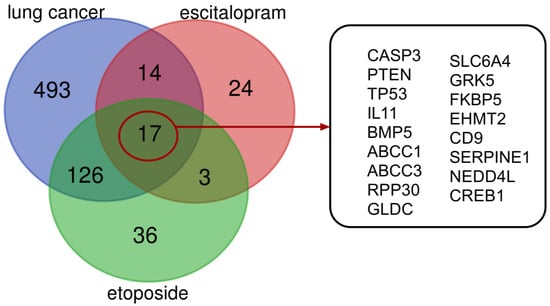 All the predicted target genes for ES, ET, and lung cancer were imported into Bioinformatics and Evolutionary Genomics (http://bioinformatics.psb.ugent.be/webtools/Venn/, (accessed on 17 January 2025)) to identify the lung cancer-related target genes of ES and ET. The Venn diagram generated by the tool illustrates the intersection of potential target genes between the drug and the disease [45].