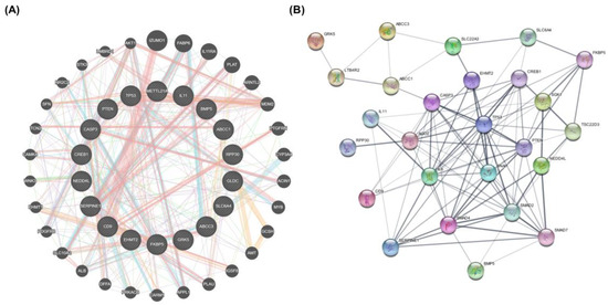 STRING protein interaction network and GeneMANIA gene interaction network. (A) GENEMANIA database results. Interaction network of the 17 genes in this network between 30 potential target genes in terms of physical and genetic interactions, co-localization, and co-expression levels. (B) Protein–protein interaction network (PPI) of intersection target genes of shared biotargets against lung cancer using the STRING database.