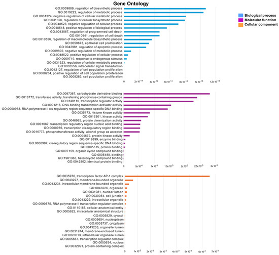 GO enrichment analysis was conducted to further examine the biological processes, cellular components, and molecular functions related with the lung cancer target of ES and ET, utilizing DAVID and CTD bioinformatics resources. The GO analysis results for the top 20 biological processes inside the intersecting network indicated that the regulation of cellular biosynthetic processes and apoptosis is significantly more regulated than other processes. In the cellular component enrichment analysis, the top 20 significant enrichment terms included mainly the AP-1 complex and organelles among the intersection network. The twenty most significant enrichment terms pertaining to molecular function indicated that carbohydrate derivative binding and transferase activity were strongly regulated (Figure 10).
