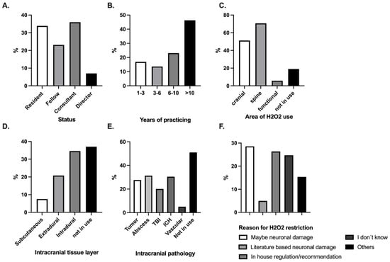 Web-based online survey on the topic “use of hydrogen peroxide in neurosurgical practice”. (A) Status in neurosurgical practice. (B) Years of neurosurgical practice. (C) Surgical area of H2O2 use. (D) Limit of intracranial tissue layer for H2O2 use. (E) Intracranial pathology where H2O2 is used. (F) Reason for restriction of H2O2 use. H2O2, hydrogen peroxide; TBI, traumatic brain injury; ICH, intracerebral hemorrhage.