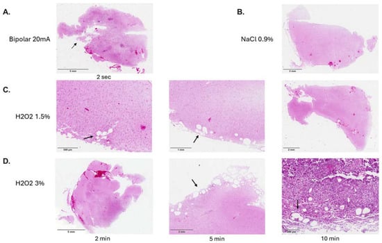 Human healthy brain tissue after exposure to bipolar cauterization (A), NaCl 0.9% (B), and H2O2 1.5%/3% (C,D). Mesothelial vacuolization as a sign of damage is visible after exposure to H2O2 (see arrows).