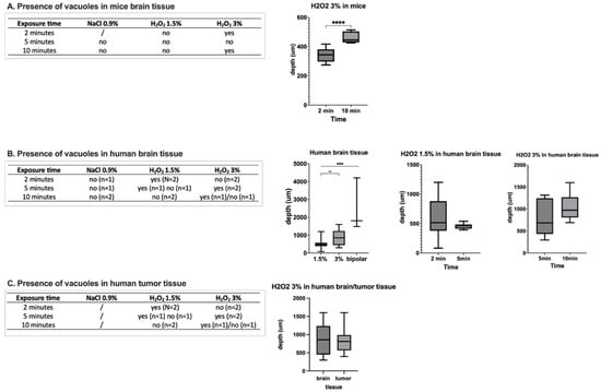 Presence and depth of vacuolization in mouse (A) and human healthy (B) tumor tissues (C). There was a significant difference depending on the concentration of H2O2 (1.5% versus 3%, p < 0.01). ** p < 0.01; *** p < 0.001; **** p < 0.0001.