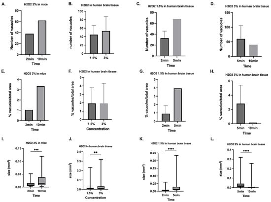 In human brain tissues, the results were inconsistent. The number of vacuoles and vacuole sizes in terms of area were not different between the different concentrations of H2O2; however, the sizes of vacuoles were significantly larger in tissues exposed to H2O2 3% compared to H2O2 1.5% (0.02 ± 0.03 mm2 versus 0.03 ± 0.06 mm2; p = 0.001; diff. 95% CI 0.004–0.025; effect size dCohen 0.2). There was a trend toward higher numbers and larger vacuole areas after longer exposure to H2O2 1.5%; however, surprisingly, the numbers of vacuoles and their areas were lower and smaller, respectively, after longer exposure to 3% H2O2.