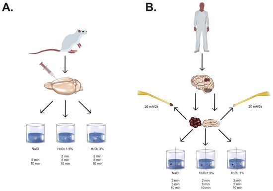 Experimental setting for mouse and human healthy/tumor brain tissue. (A) Experimental procedure in mouse brain tissue. After obtaining the brain tissue, a small puncture with 18 gauge needle 2 mm lateral from bregma in the frontal lobe was performed. Afterwards, the tissue was processed with NaCl 0.9%, H2O2 1.5%, or H2O2 3% with different time frames (2/5/10 min). (B) Experimental procedure in human brain tissue. Besides the process with NaCl 0.9%, H2O2 1.5%, or H2O2 3%, additional brain tissue was treated by bipolar cauterization at 20 mA.