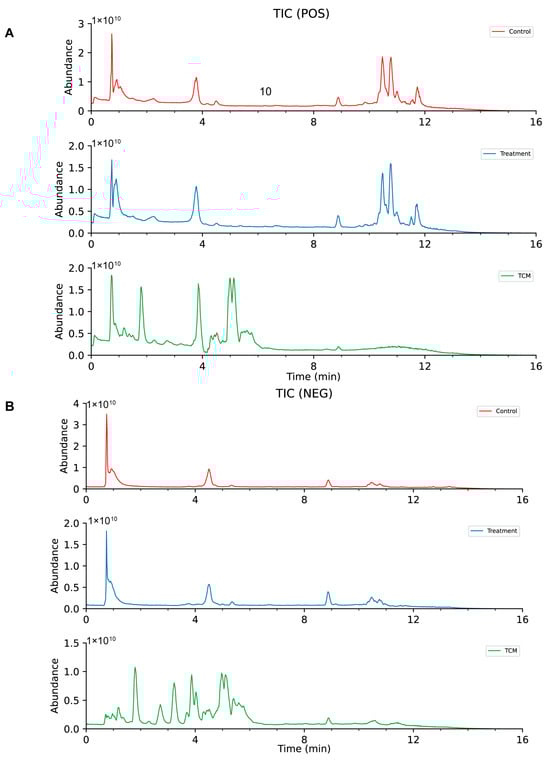 (A). Total ion chromatograms (TIC) acquired in the positive electrospray ionization (ESI+) mode (B). TIC obtained in negative ionization (ESI−) mode.