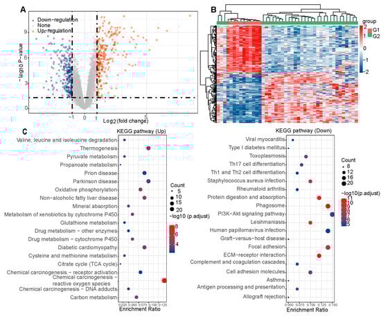 (A) The volcano plots of gene expression between normal and GC; (B) the clustered heat maps of samples between normal and GC; (C) the KEGG enrichment analysis in normal and GC.