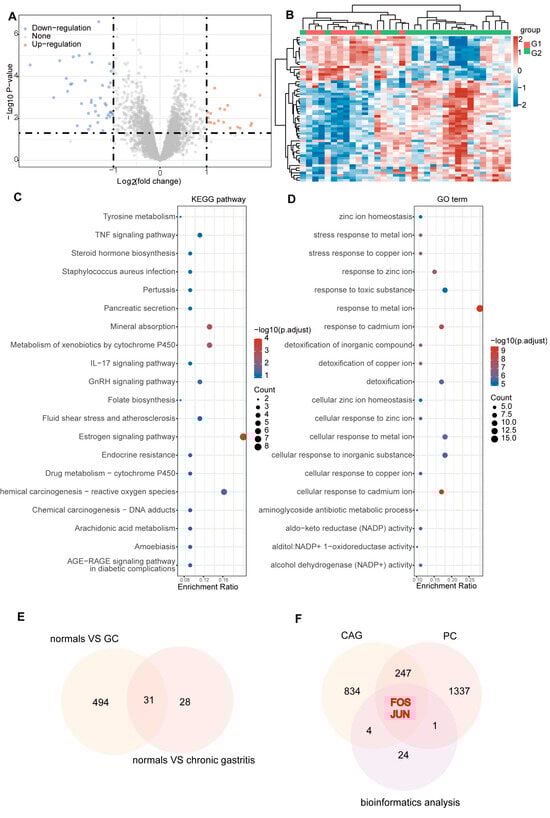 (A) The volcano plots of gene expression between normal and chronic gastritis; (B) the clustered heat maps of samples between normal and chronic gastritis; (C) the KEGG enrichment analysis in normal and gastritis; (D) the GO enrichment analysis in normal and chronic gastritis; (E) Venn diagram of targets intersection of bioinformatics analysis; (F) Venn diagram of targets intersection of CAG-PC-bioinformatics analysis. GO: Gene Ontology; KEGG: Kyoto Encyclopedia of Genes and Genomes.