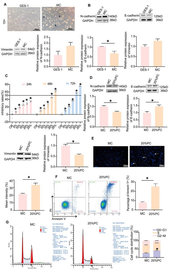 (A) Representative images of cells; Arrows indicate irregular morphology and characteristic “island-like” clonal growth patterns (see Section 2.3 for details). (B) expression of EMT-related proteins (N-cadherin, E-cadherin, Vimentin) in GES-1 cells and MC cells was determined by Western blot. Protein levels were quantified using ImageJ 1.54f; (C) effect of PC on MC cell viability at 5–25% serum concentration; (D) expression of EMT-related proteins (N-cadherin, E-cadherin, Vimentin) in MC cells and cells treated with 20% PC extract-containing serum was analyzed by Western blot. Protein levels were quantified using ImageJ 1.54f; (E) Hoechst 33342 staining of MC cells and 20% PC-treated cells observed by fluorescence microscopy. Fluorescence intensity was quantified and presented as bar graphs; Arrows represent MC cells treated with 20% PC extract-containing serum displayed characteristic apoptotic features (as described in Section 2.3). (F) apoptosis of MC cells treated with 20% PC was analyzed by Annexin V/PI staining. Apoptotic rates are shown in bar graphs; (G) cell cycle distribution of MC cells treated with PC was analyzed by PI staining. DNA content was measured to assess G0/G1, S, and G2/M phases. All data are expressed as mean ± SEM. * p < 0.05.