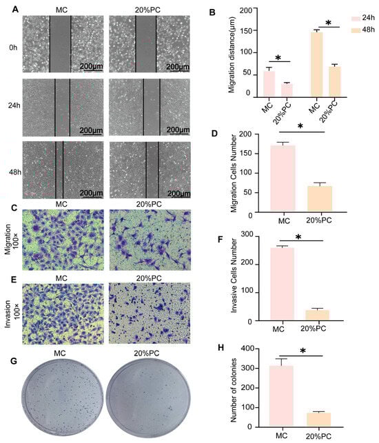 PC extract-containing serum suppresses the migration, invasion, proliferation and clonogenicity of MC cells. (A,B) scratch assay assessing PC’s effect on MC cell migration. Wound closure was monitored at 24 h and 48 h using inverted microscopy. Distance of migration is shown in bar graphs. (C,D) transwell migration assay evaluating PC’s effect on MC cell motility. Magnified views: 100× in (C). (E,F) matrigel-coated transwell invasion assay assessing PC’s inhibitory effect. The number of cells passing through the chamber is shown in bar graphs. Magnified views: 100× in (E). (G,H) colony formation assay demonstrating PC’s suppression of MC cell clonogenicity. Colonies were counted after crystal violet staining and statistically analyzed. All data are expressed as mean ± SEM. * p < 0.05.
