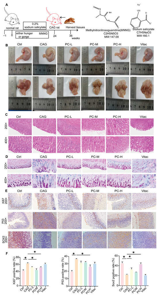 (A) CAG rats modeling cycle and chemical structure of the drug used for modeling. (B) Representative morphology of stomach image of rats; (C) Typical representative sections HE of gastric histopathology in rats; Magnified views: 200×; 400×. (D) Assessment of intestinal chemotaxis using AB-PAS; Magnified views: 200×; 400×. (E) Representative IHC images of Ki67, P53 and SOX2 are shown; Magnified views: 200×. (F) The statistical chart of immunohistochemistry staining. Ctrl, control; PC-L, PC low-dose group; PC-M, PC middle-dose group; PC-H, PC high-dose group. All data represent the mean ± SEM. * p < 0.05.