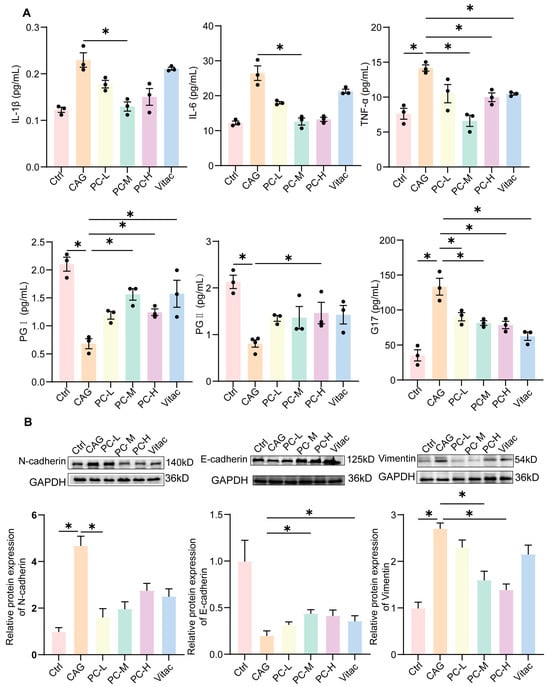 (A) Serum levels of IL-1β, IL-6, TNF-α, PG I, PG II, and G17 were measured to evaluate the effect of PC. (B) EMT-related protein expression in gastric tissues. Western blot analysis of N-cadherin, E-cadherin, and Vimentin expression. Protein bands were quantified by densitometry using ImageJ 1.54f. All data represent the mean ± SEM. * p < 0.05.