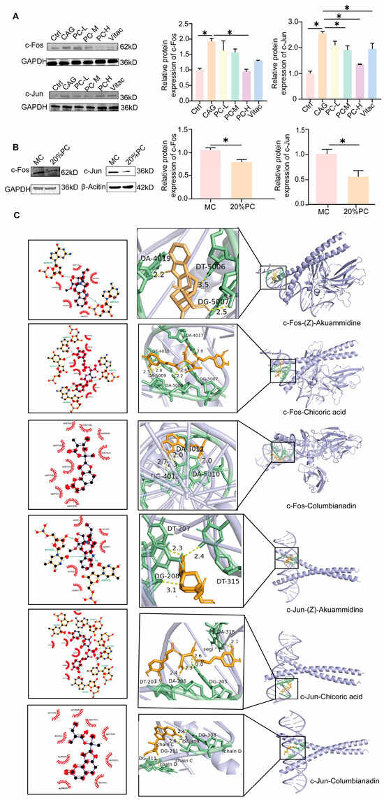Verification of key targets: (A) c-Fos and c-Jun protein levels in gastric tissue of rats were analyzed by Western blot; Protein bands were quantified by densitometry using ImageJ 1.54f. (B) c-Fos and c-Jun protein levels in MC cells were analyzed by Western blot; Protein bands were quantified by densitometry using ImageJ 1.54f. All data represent the mean ± SEM. * p < 0.05. (C) Molecular docking of potential active components of PC with c-Fos/c-Jun.