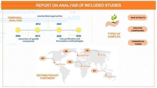 | Petit C et al., 2016 [28] | Switzerland | Angelica archangelica (L.) H.Karst. | Furanocoumarins | Methanolic Extracts | 10 mg/mL |