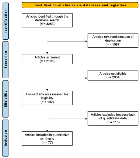 The systematic literature search resulted in the identification of 3283 articles. After removing duplicates, the abstracts of 2196 articles were screened for eligibility. A total of 2004 articles were excluded for the following reasons: mismatch with the predefined study design criteria (n = 1123), full-text unavailability (n = 725), and language limitations (n = 156). Of the remaining 192 studies, another 115 were excluded after full-text evaluation. Consequently, a final selection of 77 studies [21,22,23,24,25,26,27,28,29,30,31,32,33,34,35,36,37,38,39,40,41,42,43,44,45,46,47,48,49,50,51,52,53,54,55,56,57,58,59,60,61,62,63,64,65,66,67,68,69,70,71,72,73,74,75,76,77,78,79,80,81,82,83,84,85,86,87,88,89,90,91,92,93,94,95,96] was included in this systematic review. The results of the literature search are shown in Figure 1.