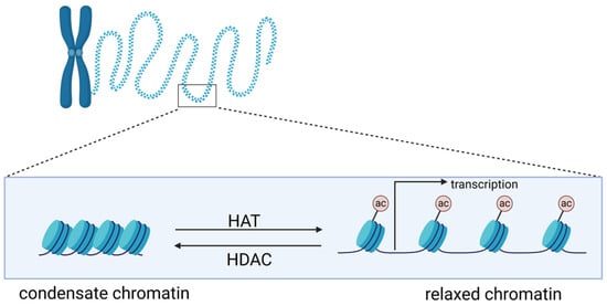 Histones are a family of proteins that provide structural support for chromatin, which further condenses to form chromosomes. In eukaryotes, DNA in chromatin is organized in arrays of nucleosomes [18], and two copies of each histone protein (H2A, H2B, H3, and H4) are assembled into an octamer around which 146 base pairs of DNA wraps to form a nucleosome core [19]. Nucleosomes play a crucial role as the principal packaging element of genomic DNA, of which the structures are determinant for DNA accessibility by endogenous and exogenous molecules, including drugs [20]. Histones have a flexible and charged NH2-terminus (also termed histone tail) that protrudes from the nucleosome, and their posttranslational modifications, like methylation and acetylation, could alter chromatin architecture [21]. The level of histone acetylation is determined by the activities of histone acetyltransferases (HATs) and histone deacetylases (HDACs), which reversibly regulate histone acetylation [22]. HATs catalyze the transfer of acetyl groups to lysine residues, which could neutralize the positive charge of lysine, such that the interaction of histones with negatively charged DNA would be weakened, resulting in an increase in DNA accessibility and transcription activation. In contrast, HDACs remove acetyl groups from histones, leading to chromatin condensation [23,24]. Thus, inhibiting HDAC activity could increase the level of acetylation of histones, relaxing genomic DNA in chromatin to proteins and genotoxic drugs [20]. The former could activate specific transcription (Figure 1), and the latter may promote cytotoxicity of genotoxic drugs like cisplatin.