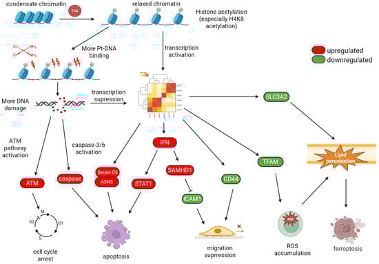 How TSA-induced histone hyperacetylation impacts the downstream biological process to promote cisplatin cytotoxicity against cancer cells is a crucial scientific issue attracting the attention of researchers in this field. A previous study reported that when A549 cells were treated with TSA and cisplatin, antiapoptotic factor cFLIP was shown to be downregulated, which activated caspase-8 to promote apoptosis [160]. For the cisplatin-resistant human bladder cancer cell line T24R2, concomitant TSA treatment increased the expression of cleaved caspase-3/9 and proapoptotic Bad and Bax, enhancing cisplatin-induced apoptosis [161]. Similarly, TSA upregulated p71 and induced Bax-dependent apoptosis to promote sensitivity of cisplatin towards cisplatin-resistant ovarian cancer cells [162]. Moreover, the TSA-induced overexpression of death-associated protein kinase, which in turn activated DAPK signaling, was demonstrated to be a way in which TSA sensitized cisplatin-resistant A549 cells to cisplatin [163]. In our recent work, we demonstrated that TSA promoted cisplatin-induced apoptosis of A549 cells through activating caspases 3 and 6, which was accompanied by the increase in cleaved poly-ADP-ribose polymerase (PARP) and the degradation of lamin A&C attributed to the presence of TSA [17]. Our proteomics analysis data also indicated that TSA co-treatment led to the upregulation of the transcription factor signal transducer and activator of transcription 1 (STAT1) and the hydrolase sterile alpha motif and histidine-aspartate domain-containing protein 1 (SAMHD1) via IFN-γ/α/β signaling, while it downregulated the intercellular adhesion molecule 1 (ICAM1) and CD44. These effects collectively contribute to enhancement in cisplatin efficiency and reduction in cell migration [17].