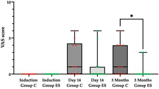 VAS score for pain in the control Group C (red) and the experimental Group ES (green) at induction, at 14 days, and at 3 months. Statistically significant difference (p = 0.0120) at the level of significance α = 0.05, employing the Mann–Whitney test, denoted as *.