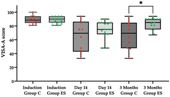 VISA-A score for pain in the control Group C (red) and the experimental Group ES (green) at induction, at 14 days, and at 3 months. Statistically significant difference (p = 0.0340) at the level of significance α = 0.05, employing the Mann–Whitney test, denoted as *.