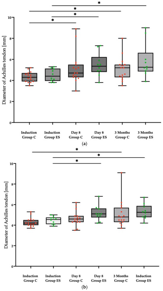 Longitudinal incidence ultrasound measurements of the diameter [mm] of the Achilles tendon in the control Group C (red) and the experimental Group ES (green) at induction, day 8, and 3 months, for both the left (a) and the right (b) leg. Statistically significant differences (p < 0.05) at the level of significance α = 0.05, employing the paired t-test (assumes Gaussian distribution), denoted as *.