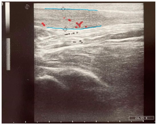 The ultrasound examination utilized an MyLab (Esaote, Noida, Uttar Pradesh, India) ultrasound machine with a linear probe (4–13 MHz) and a General Electric Venue 50 ultrasound machine with a linear probe (6–15 MHz), both equipped with grayscale and color Doppler. The evaluation was conducted by two independent evaluators, maintaining consistent landmarks for measurements. Patients were examined in 90° dorsiflexion, with their feet positioned at the distal end of the examination table, and measurements were taken at a distance of 45 mm from the calcaneal tendon insertion. To highlight pathological neovascularization and avoid false-positive results of vascularity using color Doppler, measurements were taken after 30 min of sustained physical exertion [].
