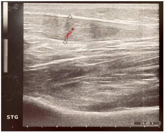 Longitudinal incidence ultrasound at treatment induction showing the physiological appearance of the Achilles tendon—diameter of 4.8 mm.