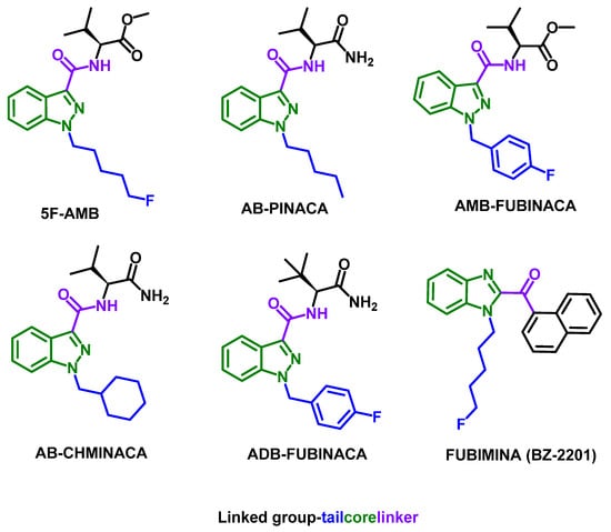 Herein, the evaluation of the binding affinity of six synthetic cannabinoids (Figure 1) to HSA is described. The library comprises five indazole carboxamides, 5F-AMB, AB-PINACA, AMB-FUBINACA, AB-CHMINACA, and ADB-FUBINACA, and one benzimidazole, FUBIMINA (BZ-2201). Structurally, they consist of a “core”, a “linker”, a “linked group”, and a “tail” (Figure 1). For the indazole carboxamides, displacement experiments with well-known probes were carried out to obtain information on the specific sites that drugs bind to HSA. Both studies were performed with HPAC using an HSA-based column [33,34]. Additionally, docking studies were performed to analyze the binding sites and better understand the interaction mechanisms between the synthetic cannabinoids and the protein.