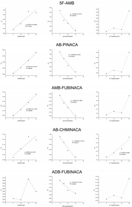 As shown in Figure 2, a decrease in k values with increasing warfarin concentrations was observed for all synthetic cannabinoids except ADB-FUBINACA, which exhibited random variations. Moreover, a linear relationship with a positive slope is observed in the plot of 1/k versus warfarin concentration. This suggests that the studied synthetic cannabinoids, except for ADB-FUBINACA, compete with warfarin for binding site I [28].