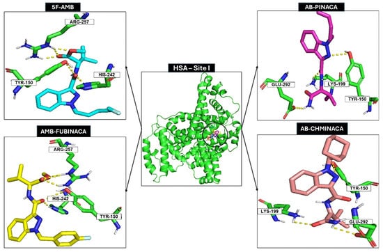 Docking scores confirmed the binding affinity of 5F-AMB, AB-PINACA, AMB-FUBINACA, and AB-CHMINACA for site I of HSA, and the most relevant interactions were identified.