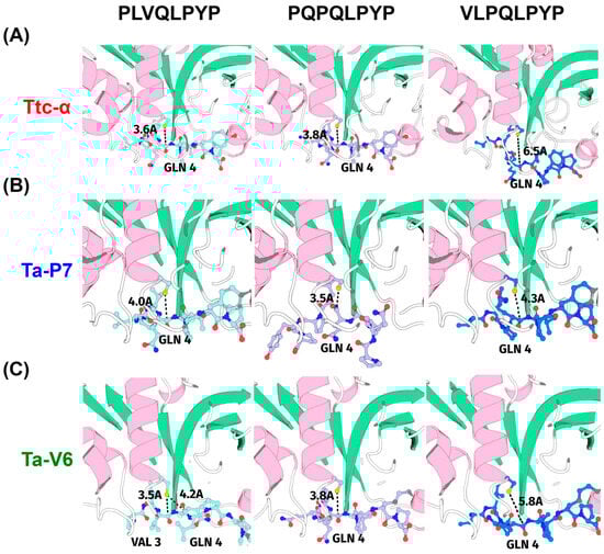Enzyme substrate model for the wheat proteins of Triticum aestivum L. The enzyme is shown as a cartoon, the substrate as balls and sticks, the labels GLN4 (Q4) and VAL3 (V3) annotate cleavage sites in the substrate, and the distance from the attacking sulfur atom to the attacked carbonyl is shown as a black dotted line. Representation of the complex Ttc-α (A), Ta-P7 (B), or Ta-V6 (C) with the peptides PLVQLPYP (left panel), PQPQLPYP (middle panel), and VLPQLPYP (right panel).