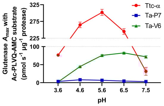 Ta-P7 and Ta-V6, as well as Triticain-α (as a comparative control), were evaluated for enzymatic cleavage specificity using a fluorogenic peptide substrate derived from the gluten protein components, Ac-PLVQ-AMC [23,24], in buffers of different pH. Based on the obtained characteristics of the enzymatic reaction, the kinetic parameters of Ac-PLVQ-AMC hydrolysis, namely the Michaelis constant (KM), the maximum enzyme activity (Amax), and the catalytic constant (kcat), were calculated (Table 1 and Figure 3). The results showed that Ac-PLVQ-AMC was most efficiently cleaved by Triticain-α, especially at pH 3.6–5.6. Ta-P7 hydrolyzed Ac-PLVQ-AMC inefficiently over the entire pH range studied, despite comparable affinity for the substrate. In contrast, Ta-V6 cleaved Ac-PLVQ-AMC less efficiently than Triticain-α, with increasing efficiency with increasing pH (Table 1 and Figure 3).