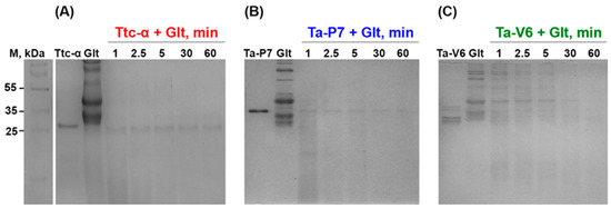 The degradation of the bulk wheat gluten fraction by the new recombinant Ta-P7 and Ta-V6, as well as Triticain-α (as a comparative control), was first studied by incubating the corresponding reaction mixtures at 37 °C and pH 4.6, followed by analysis by SDS-PAGE. The protein bands that appeared in Coomassie-stained gels in samples treated with the corresponding enzymes were compared to undigested gluten, indicating degradation of the latter. As shown in Figure 4, after 1 h of incubation for all the enzyme mixtures studied with gluten, the bands of the latter underwent almost complete degradation, and for both Ta-P7 and Ttriticain-α, this process took less than 5 min (Figure 4A,B), while Ta-V6 required from 30 to 60 min (Figure 4C).