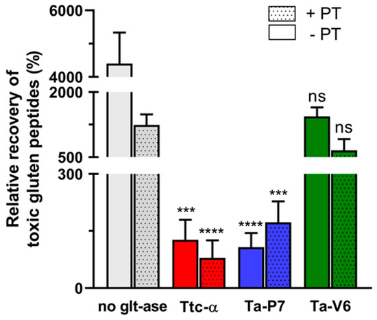 As shown in Figure 5, the gluten fractions in the presence of the studied glutenases gave lower recoveries compared to the PT digest alone, with Triticain-α and Ta-P7 being particularly effective. In addition, it was statistically demonstrated that Triticain-α was effective in reducing the levels of toxic gluten components in the presence of PT digest under the conditions studied. No significant difference was observed in samples treated with Ta-V6.