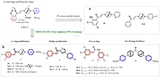 - Skeleton diversification; we focused on a 5-membered ring on the bridge part of PFI-3 for compounds 3a and 3b and two A-rings (for 4a–k) and two B-ring derivatives (for 5).