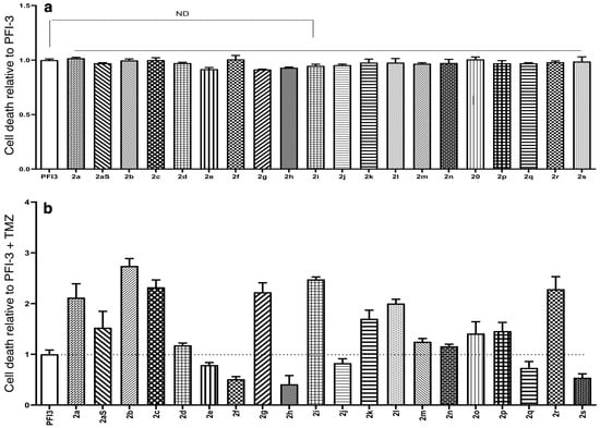 The activity of series 2 with PFI-3 to sensitize GBM cells to TMZ-induced cell death. (a) With TMZ. (b) Without TMZ. LN229 GBM cells were treated with PFI-3 or the indicated series 2 (20 μM) in combination with TMZ (200 μM). Control cells were treated with vehicle (DMSO). Treatment with TEDs alone had no effect on cell viability. Cell death was determined by ELISA at 72 h, which quantifies histone-complexed DNA fragments. Results were normalized to the GBM cell death-inducing activity of PFI-3 alone (aA), or PFI-3 in combination with TMZ (b).
