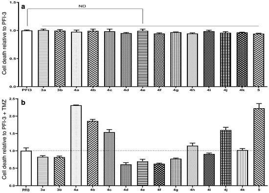 We explored the structural activity relationship (SAR) of scaffolded analogs 2, 3, 4, and 5, as demonstrated in Figure 2 and Figure 3. Like PFI-3, none of the newly designed analogs had any effect on GBM cell death (Figure 2a and Figure 3a). However, when treated in combination with TMZ, some of the newly designed analogs of (2, 3, 4, and 5) markedly increased GBM sensitivity to the cell-death-inducing activity of TMZ (Figure 2b and Figure 3b). We have previously shown that 200 μM TMZ had only a minimal effect on GBM cell viability [13]. It is important to note that compounds of series 2 (2a, 2b, 2c, 2d, 2g, 2i, 2k, 2l, and 2r), 4 (4a, 4b, 4c, 4g, and 4j), and 5 were found to be superior to PFI-3 in enhancing the activity of TMZ to induce GBM cell death, as summarized in Figure 4. Showing the importance of chirality in the bromodomain inhibitors, the R-isomer 2a (Figure 1) had greater activity than the S-isomer 2as (Scheme 1), showing the highest binding for the R-isomer. Further refinements of the structure by inserting a 5-membered ring in compounds 3a and 3b (Scheme 3) showed their activity in GBM cells to be less in the TMZ-induced cell relative to PFI-3. Treatment of GBM cells with dimeric compound 5 resulted in an increase in the activity of TMZ-induced cell death of two times compared to PFI-3 (1). Moreover, removal of the bridge portion in compounds (urea 4a and carbamate 4b) resulted in compounds with high sensitivity to death-inducing activity with TMZ.