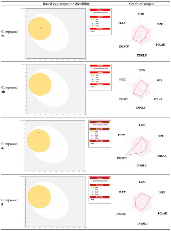 BOILED-Egg model of representative compounds 2a, 2b, 4a, and 5 and graphical output of the calculated ADME studies by SwissADME (for 2a, 2b, 4a, and 5).
