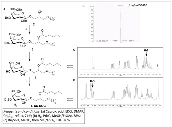 (A) Synthetic scheme for compound 1 (SC-SGG). (B) Electrospray ionization–mass spectrometry (ESI-MS) spectra (in the negative ion mode) of SC-SGG, revealing the expected m/z of 655.67. (C) 1H-NMR spectrum of compound 4. (D) 1H-NMR spectrum of SC-SGG showing the de-shielding effect on H-3, due to the introduction of the electron-withdrawing sulfate in position 3 of galactose (compound 1, H-3 is the proton in position 3 of galactose).