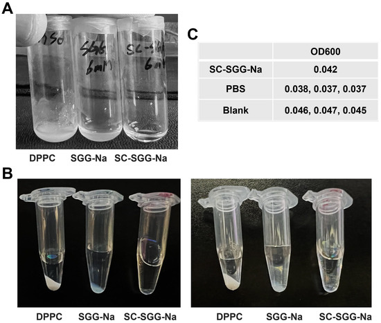 Each compound in the powder form was weighed and added into the PBS buffer containing 1% DMSO, and placed in small glass vials so that the final concentration of each lipid was 6 mM. The volume of DPPC in the suspension was 300 µL, of SGG-Na in suspension was 350 µL and of SC-SGG-Na in solution was 350 µL. The clarity/turbidity of each lipid tube was assessed by eyeing and the tubes were photographed. The DPPC suspension, SGG-Na suspension and SC-SGG solution were each then transferred into a clear Eppendorf tube, and subjected to centrifugation at 14,000× g for 15 min to determine whether there was pellet formation at the bottom of the tube. Finally, the SC-SGG-Na solution (50 µL) was placed in a well of a microtiter plate along with PBS (50 µL) in three adjacent wells. OD at 600 nm (revealing turbidity or precipitated materials) was read on SC-SGG-Na, PBS as well as neighboring blank wells by a SpectraMax Plus 384 plate reader (Molecular Devices, San Jose, CA, USA).