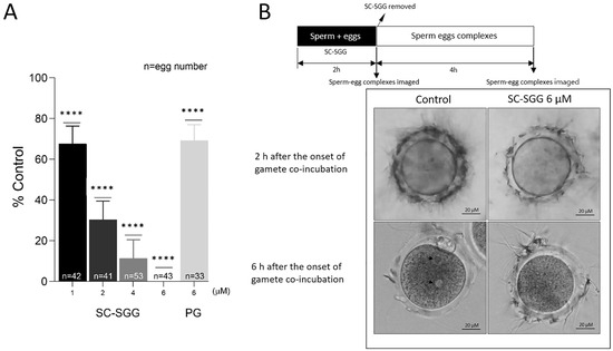 (A) Inhibition of mouse in vitro fertilization by SC-SGG present during the gamete co-incubates. Mouse mature eggs (10–20) were co-incubated with capacitated mouse sperm (1 million) in a culture plate in 500 µL of KSOM-0.1% BSA containing various concentrations of SC-SGG (0, 1, 2, 4 and 6 µM) or PG (6 µM). Gamete co-incubates treated with 0 µM SC-SGG (untreated) served as controls. The gametes were co-incubated (37 °C, 5% CO2) for 2 h to allow sperm to bind to the eggs at the zona pellucida. At the end of this time period, sperm–egg complexes were removed from the culture plate well and washed successively in 50 µL droplets of KSOM-0.1% BSA + amino acid (both essential and non-essential) supplements (KSOM-0.1%BSA-AA) to remove loosely bound sperm and their images were microscopically recorded. The sperm–egg complexes were further cultured in the 50 µL droplet for another 4 h, and each egg was then assessed for the presence of two pronuclei, as the indication of successful fertilization. The in vitro fertilization rates from three replicate experiments were reported as means ± SDs of percent control (untreated gamete co-incubates). ANOVA was performed on the raw data (% eggs fertilized) of all samples. **** denotes p < 0.0001. n = total number of eggs in all replicate experiments. (B) Images of sperm–egg complexes from gamete co-incubates (with or without treatment with 6 µM SC-SGG) at 2 h after exposure to SC-SGG, and at 6 h (4 h after sperm-complexes were cultured in fresh KSOM-0.1% BSA-AA). Note that the arrow heads mark the two pronuclei in an egg from the control sample.