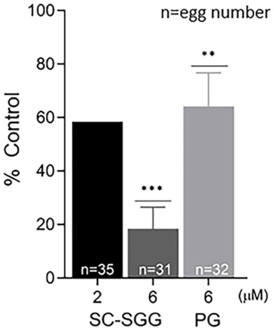 Pretreatment of sperm with SC-SGG reduces their ability to fertilize eggs. Capacitated Percoll gradient-centrifuged (PGC) sperm resuspended in KRB-0.03% BSA (>90% motile with hyperactivated motility patterns) at 10 million sperm/mL were treated with 0, 2 and 6 µM SC-SGG or 6 µM PG (37 °C, 5% CO2, 15 min). Capacitated PGC sperm treated with 0 µM SC-SGG (untreated) served as controls. After removing excess SC-SGG and PG from sperm by low-speed centrifugation, one million of these sperm were added into 500 µL of KSOM-0.03% BSA in a culture plate containing untreated eggs (10–15 eggs). The gamete co-incubation duration (2 h) in the culture plate, the washing of excess unbound sperm from the sperm–egg complexes and further culturing (another 4 h) of the sperm–egg complexes in droplets of KSOM-0.1% BSA-AA were performed following the same procedures as described in Figure 4. The presence of two pronuclei in each egg, as the indication of successful fertilization, was then assessed. The in vitro fertilization rates of the gamete co-incubates with sperm pretreated with 6 µM SC-SGG or 6 µM PG were reported as means ± SDs of percent control from three replicate experiments. ANOVA was performed on the raw data (% eggs fertilized) among untreated control samples and those with sperm pretreated with 6 µM SC-SGG or 6 µM PG. **, *** denote p < 0.01 and 0.001, respectively. However, experiments with sperm pretreated with 2 µM SC-SGG were performed twice, and the average of their percent control was reported. n = total number of eggs in all replicate experiments.